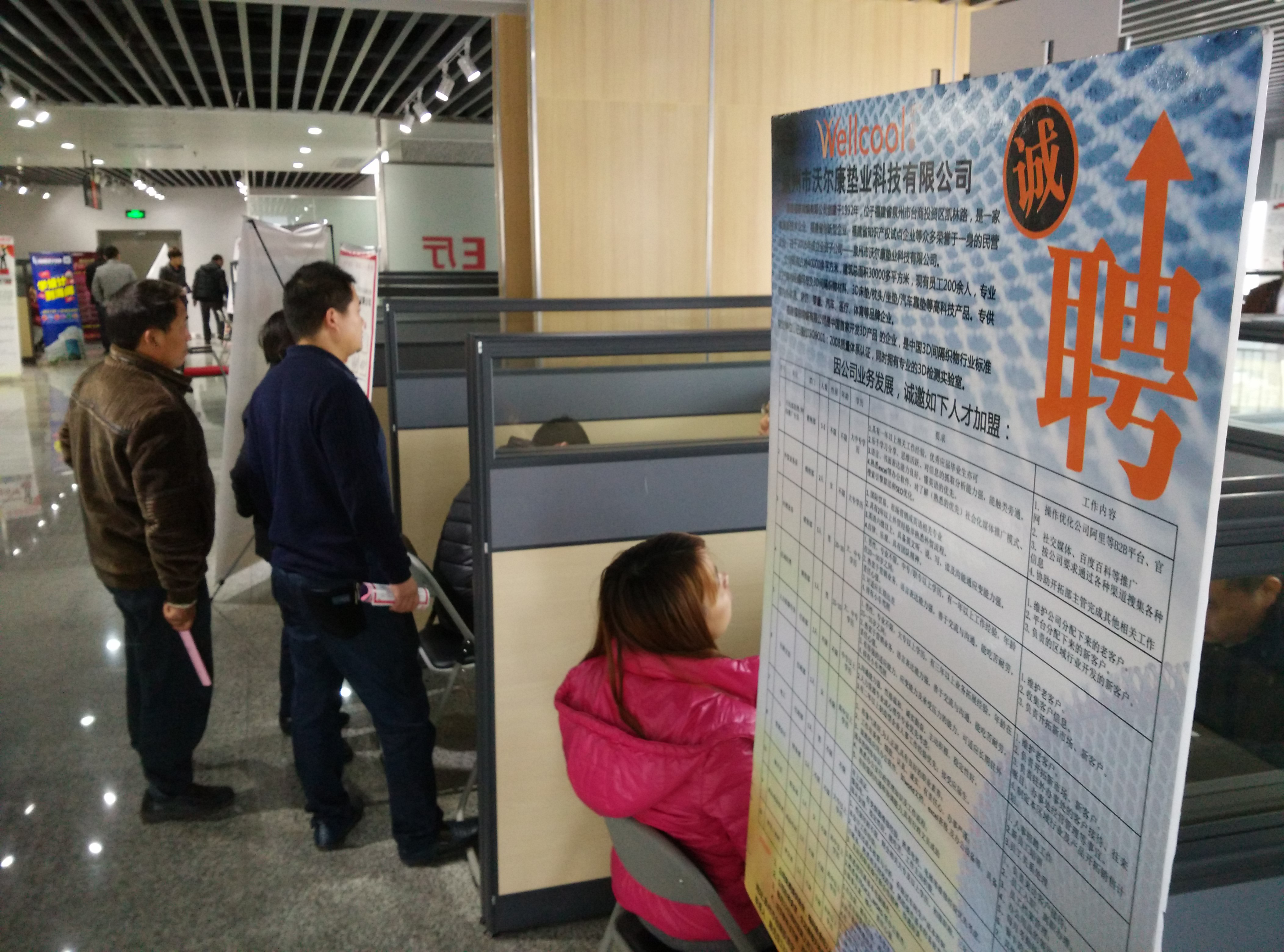 在与该负责人交流中,一名年轻女子正好前来咨询。该女子姓张,之前在广东务工,因为父母亲都在石狮工作,今年便决定也来石狮找工作。之前从事的是销售跟单员的工作,因此她想找个类似的职位,并希望有较大的晋升空间。针对小张的求职意向,该负责人向其推荐了几个相关职位,以及不同职位晋升的条件和空间,并表示对于新入职的员工,企业会组织开展专业培训,让新职工尽快融入新的工作环境,掌握相关知识和技能。小张听了十分满意,当场填写求职意向表。