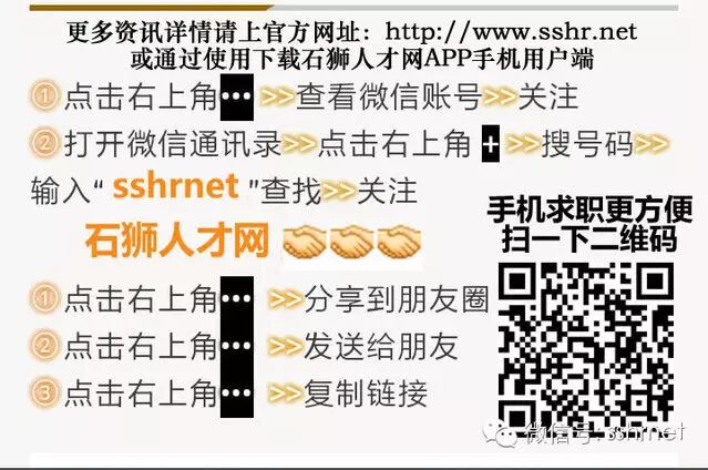 关注石狮人才网公众微信号,招聘求职还能这样,只需回复:“幸运大转盘”“砸金蛋”“水果达人”晒晒“照片墙”活动,更多礼品等您来关注。(要开工,先招工,春节招聘不二选择利器,怎么能少了石狮人才网)我的职场利器,请点击进入石狮人才网客户端http://www.sshr.net/mobile/;点击进入石狮人才网手机版http://wap.sshr.net/;点击进入石狮人才网微信版http://m.sshr.net/让招聘求职更方便。
